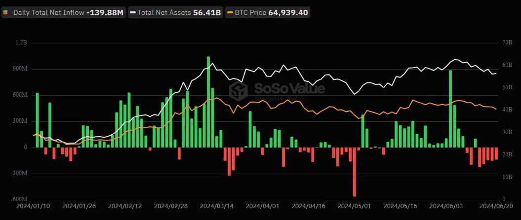 El jueves, los fondos al contado de BTC perdieron 140 millones y el precio de bitcoin se desplomó a 63.800 dólares.